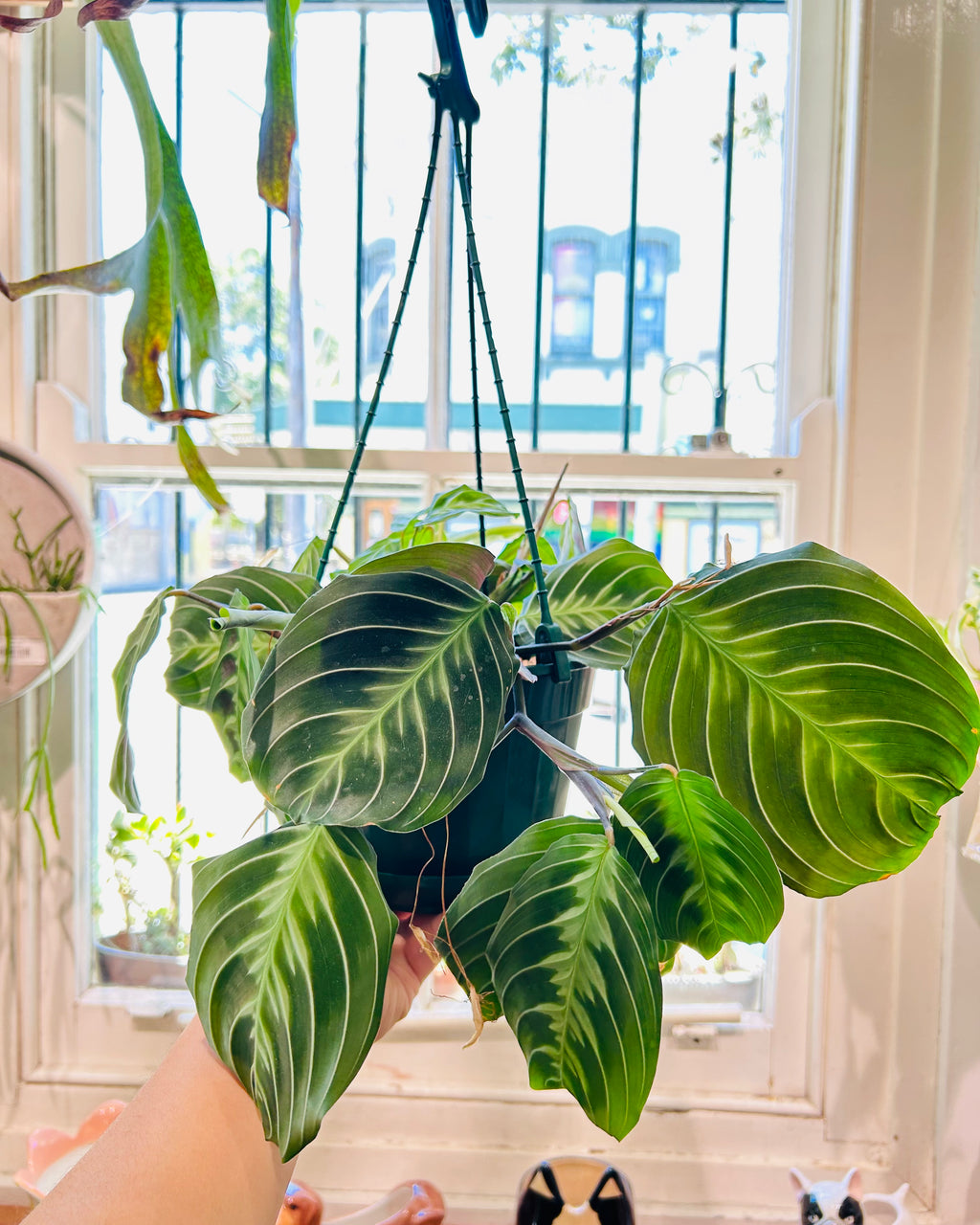 The Maranta ‘Massangeana’ is a rare and elegant prayer plant with deep green, almost black leaves marked by soft silver veins. Its foliage folds up at night in a graceful prayer-like motion. Perfect for shaded indoor spaces, it thrives in humidity and indirect light, adding dramatic contrast to any plant collection.