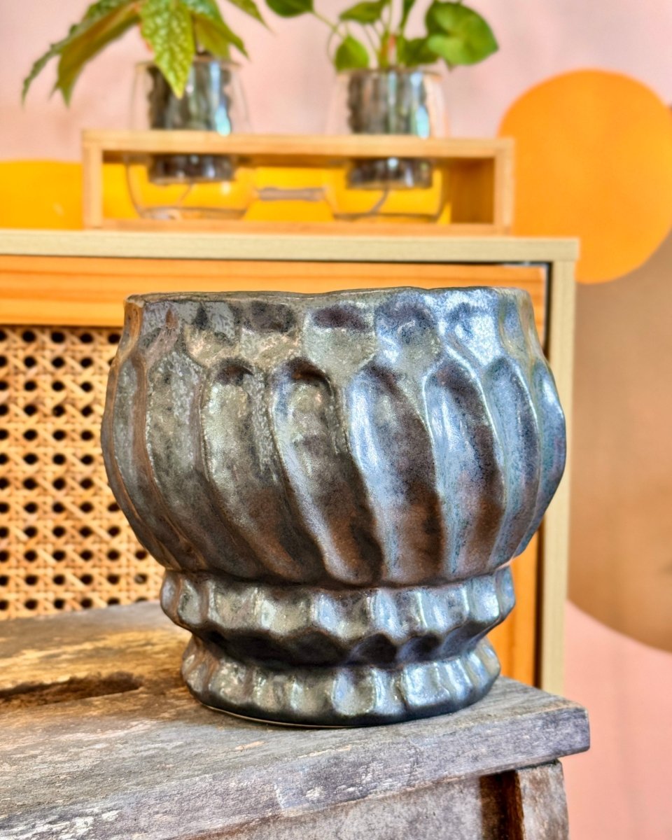 Discover the Ursula Ceramic Pot, a striking addition to your indoor plant collection with its dramatic hammered black texture that adds depth and sophistication to any space.