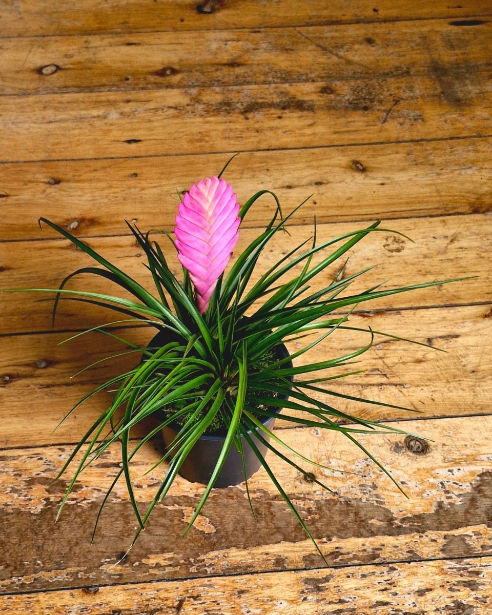 Tillandsia cyanea, commonly known as the Pink Quill Plant, is a compact, epiphytic bromeliad native to the tropical rainforests of Ecuador. It is prized for its striking, flat pink bract (the “quill”) from which vibrant purple flowers emerge. Its architectural form makes it perfect for desks, shelves, and bright indoor spaces.