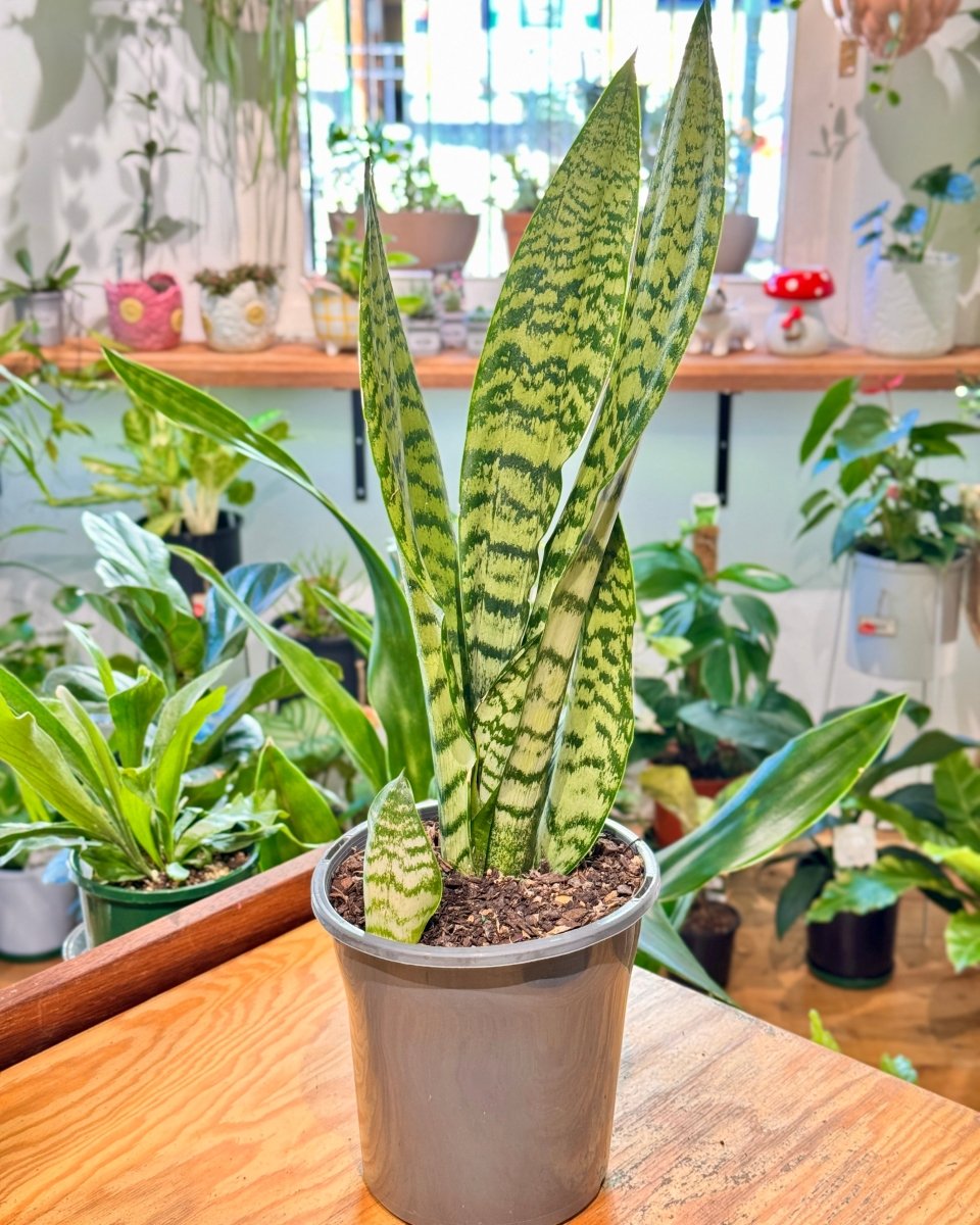 Sansevieria trifasciata ‘Laurentii’ is the classic variegated Snake Plant, prized for its upright, sword-like leaves with dark green centres, light transverse bands, and bold yellow margins that add striking contrast to any space.